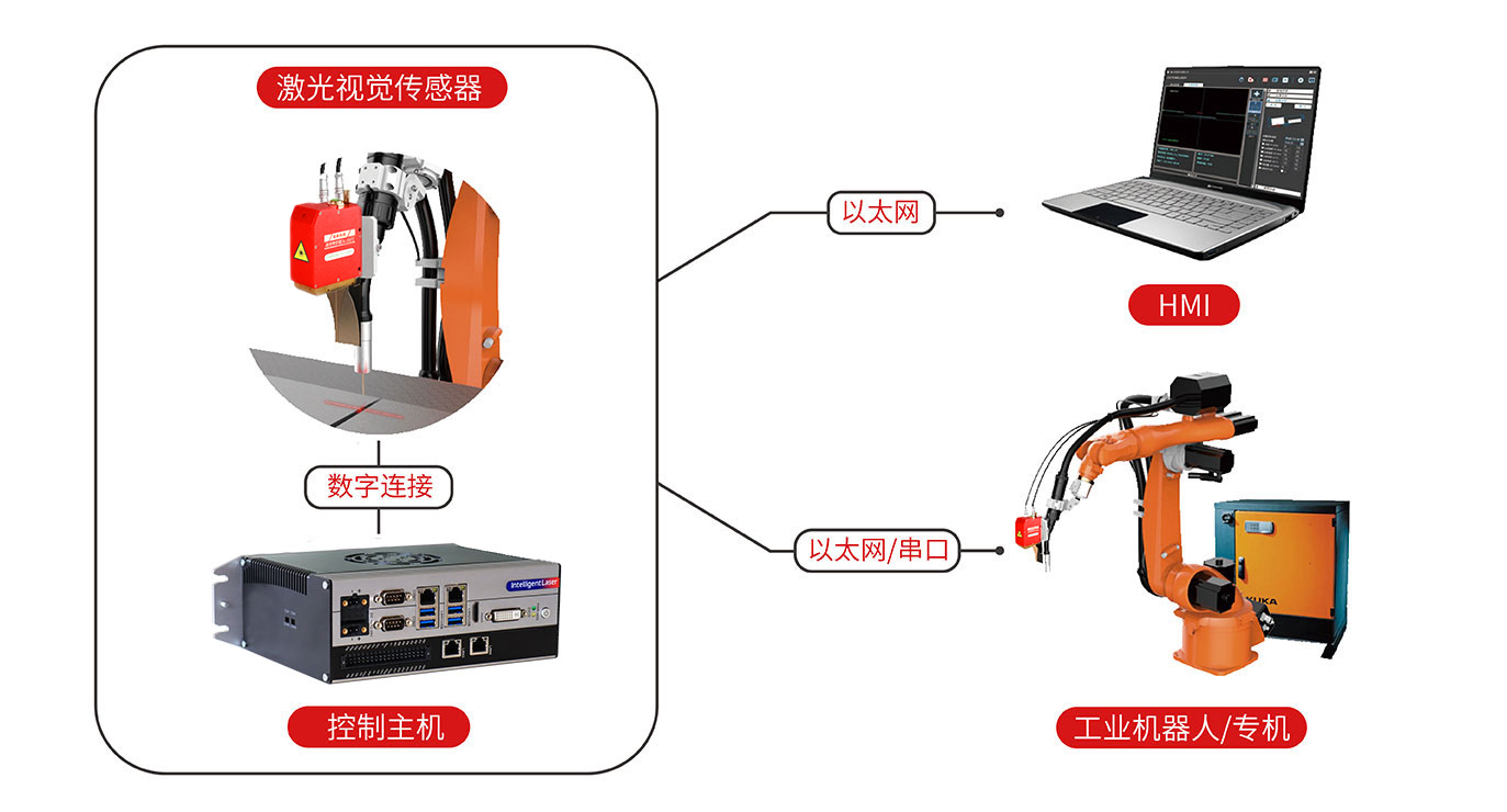 激光視覺焊縫跟蹤系統(tǒng)主要由激光傳感器和控制主機(jī)組成,激光傳感器用于焊縫信息的主動采集,控制主機(jī)負(fù)責(zé)焊縫信息的實(shí)時處理,并與工業(yè)機(jī)器人或焊接專機(jī)保持實(shí)時通信,同時具有尋位和跟蹤功能,滿足智能化焊接的需求。